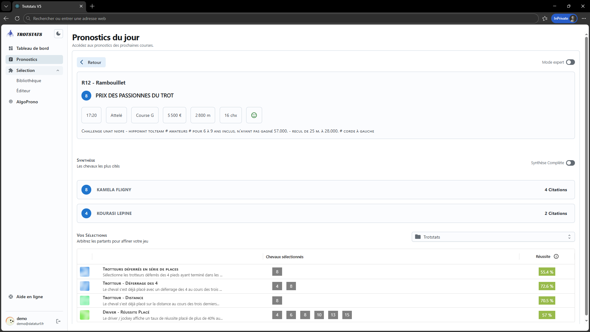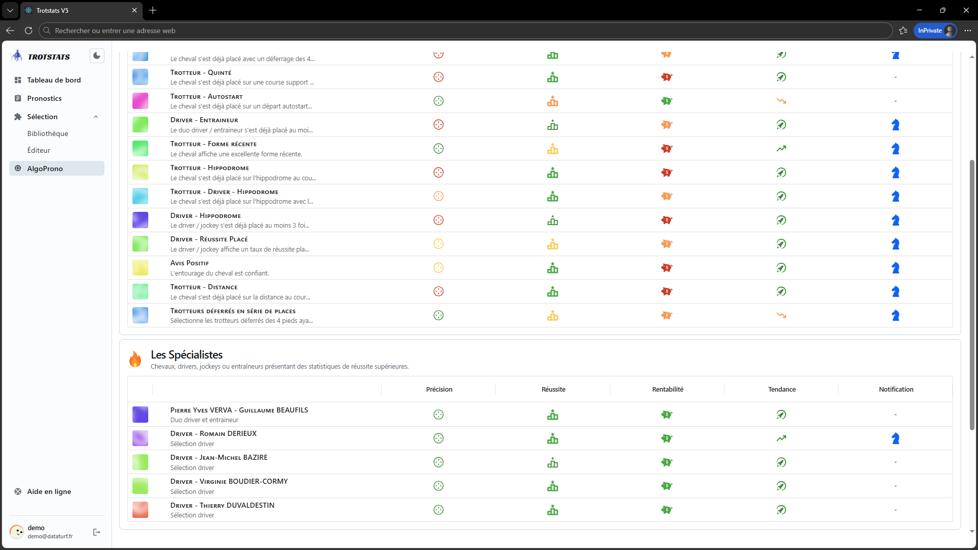 Dénicher les trotteurs aux engagements idéaux. Aptitude au terrain, catégorie de course, distance, corde et plus encore sont disponibles en quelques clics. Une vision 360° des courses PMU !