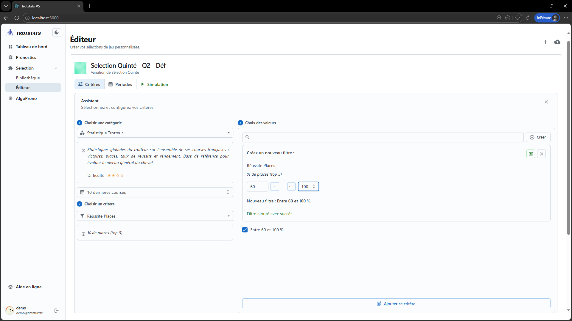 Découvrez un outil inédit dans le turf français ! Avec notre éditeur de pronostics, élaborez vos stratégies de jeu grâce à plus de 550 critères hippiques.