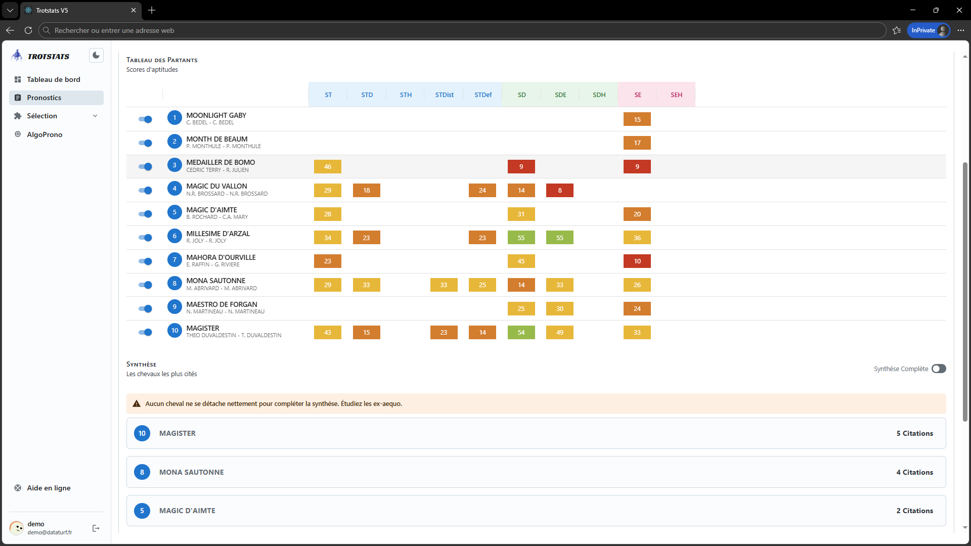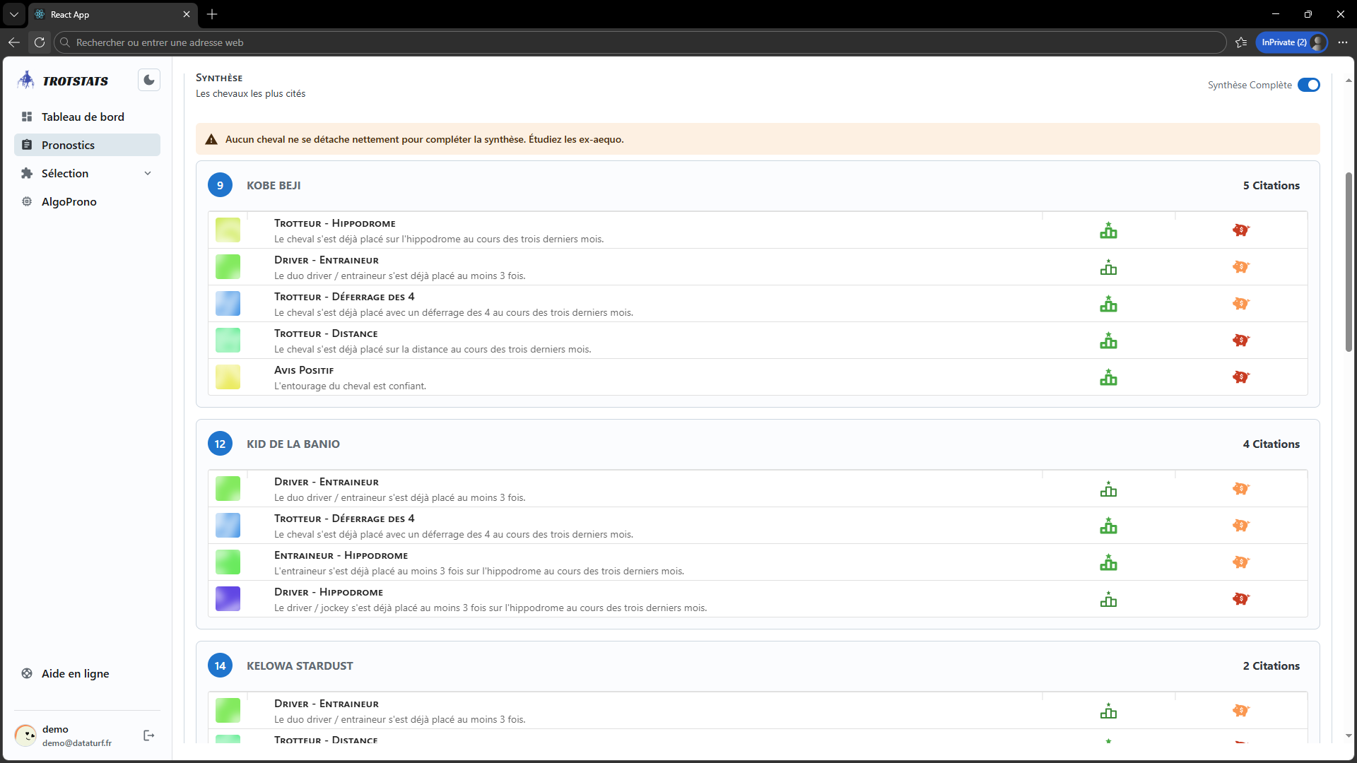Le logiciel Trotstats produit chaque jour des synthèses de jeu turf pour chaque course de trot, en utilisant une collection complète de pronostics enregistrés. Découvrez facilement les points forts et les points faibles des partants pour améliorer vos paris hippiques.